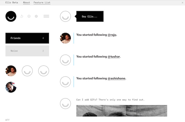 Friends are shown in a detailed feed while Noise sorts condensed posts into a two column layout so you can scan through entries quickly. Like Twitter, Ello has no friend requests – anyone can follow you and all your posts are public. Unlike Twitter, your posts can be as detailed as blogs.