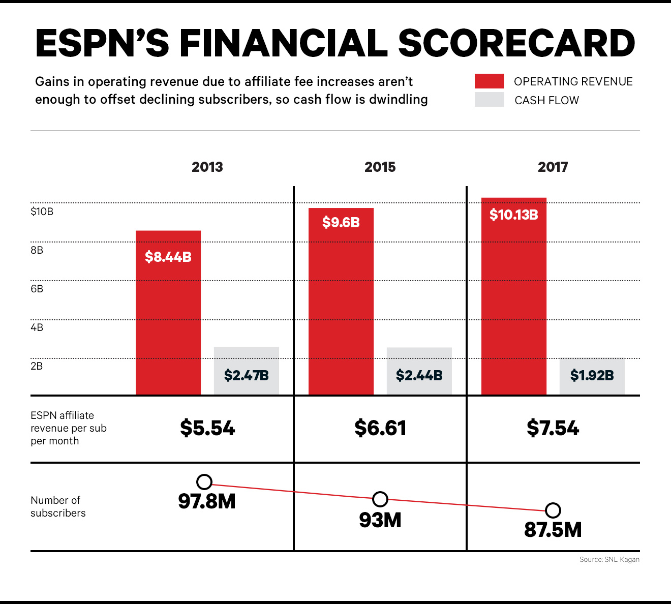 Disney’s revenue from cable networks (the majority of which comes from ESPN) in fiscal 2017 is expected to be about $16.6 billion, about 30 percent of the conglomerate’s total revenue, while profit is projected at $5.4 billion, or 35 percent, according to Barton Crockett of FBR. Crockett figures that the cable segment’s profit will decline for the next three years. Disney may agree, hence it has been cutting costs by laying off workers while it readies its standalone streaming product to make up for lost viewers and stagnating ad sales. Cash flow at ESPN will drop from $2.47 billion in 2013 to $1.92 billion in 2017, according to SNL Kagan.